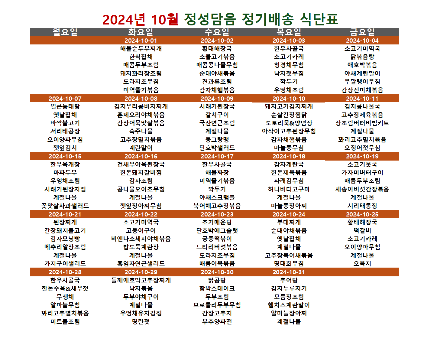정성담음 정기배송10월식단 메뉴