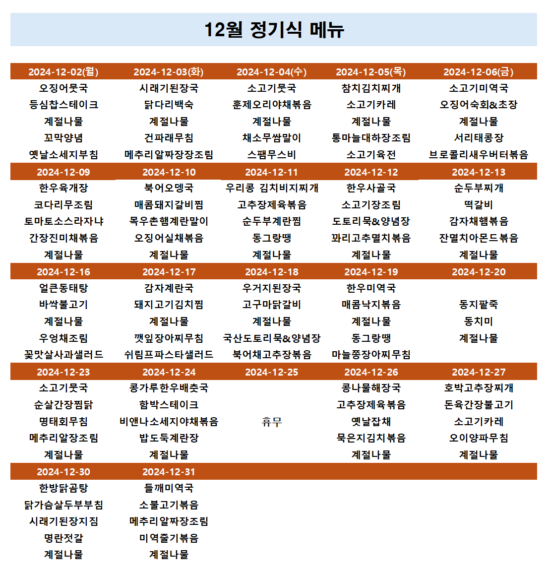 정성담음 정기배송12월식단 메뉴